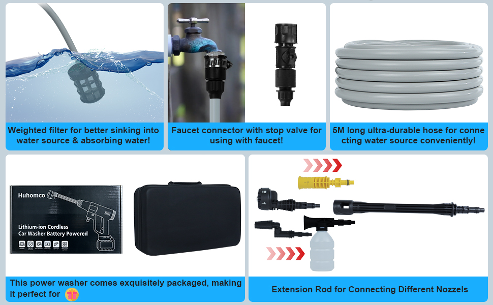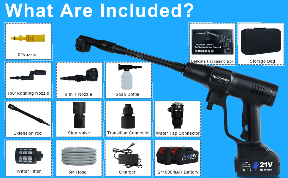 - La confezione include: 1 idropulitrice a batteria; 2 batterie da 4,0 Ah; 1 adattatore; 1 tubo dell'acqua da 5 m; 1 lancia ugello lunga 6 in 1; 1 flacone di schiuma; 1 ugello a 0°; 1 ugello a 180°; 1 filtro dell'acqua; 1 custodia