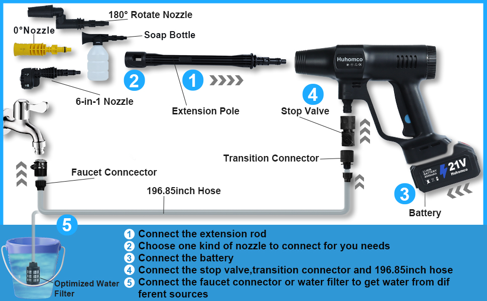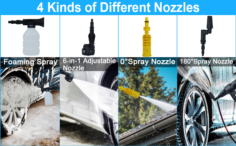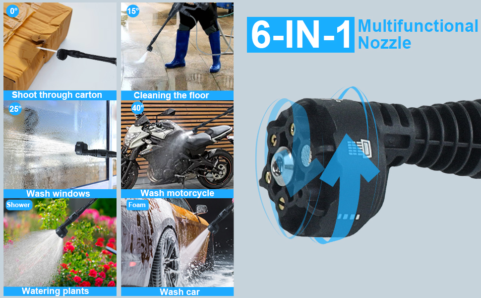 - Ugello 6 in 1: 0°, 15°, 25°, 40°, modalità a ventaglio e modalità doccia. Ampiamente utilizzato per la pulizia di veicoli, biciclette, barche, finestre e vialetti. È possibile cambiare l'idropulitrice a batteria ruotando l'ugello. Un utile strumento di pulizia per il lavaggio degli alimenti e la pulizia della casa, un valido aiuto per l'irrigazione delle piante e la pulizia degli esterni