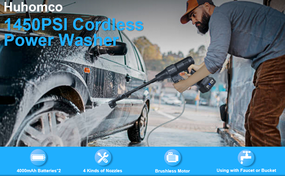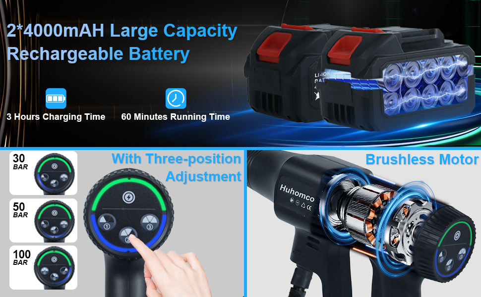 - Batterie ad alte prestazioni e durata superiore: l'idropulitrice a batteria è dotata di 2 batterie al litio ad alta capacità da 21 V e 4,0 Ah, che offrono potenza a lunga durata e prestazioni affidabili. Queste consentono un funzionamento continuo fino a 50-60 minuti! Rispetto ad altre batterie da 3000 mAh, le batterie Huhomco sono più potenti ed efficienti