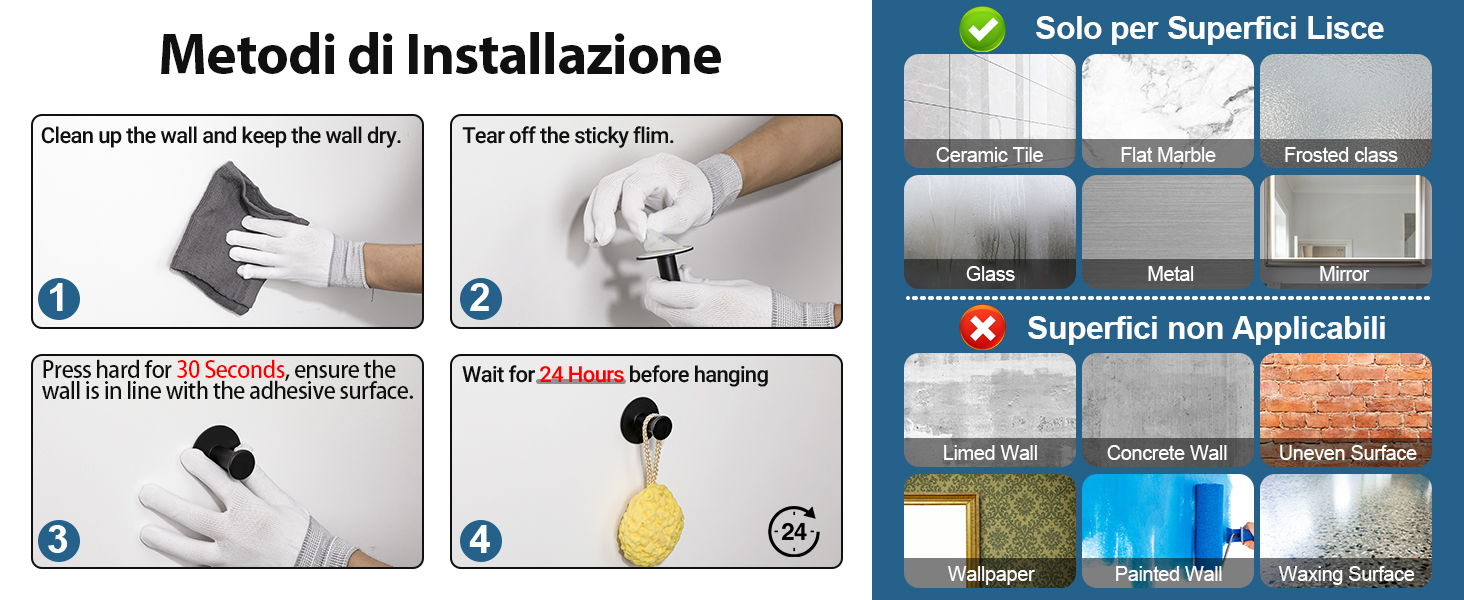 - Superficie Applicabile - Ganci adesivi sono adatti solo per superfici piane e lisce come piastrelle, marmo, vetro, mobili in metallo, armadi in legno, ecc. Non adatto per pareti dipinte, pareti in cemento grezzo, pareti in mattoni, intonaco e superfici ruvide.