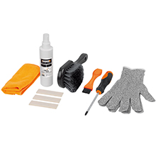 2 spazzole, lama abrasiva, 1 cacciavite, guanti, spray e 1 panno di pulizia.