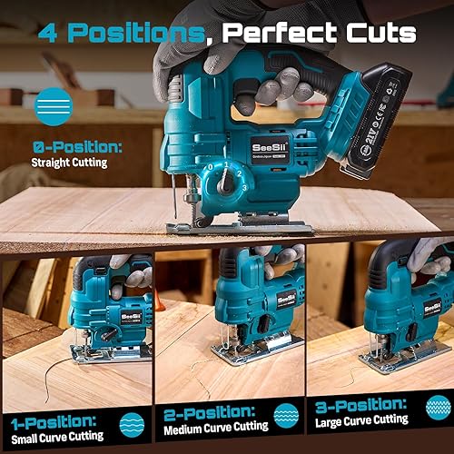Seghetto Alternativo a Batteria Seesii 21V, Seghetto Elettrico con 2 Batterie da 2.0 Ah, Velocità Variabile 2800 Giri/Minuto per Taglio Legno, Illuminazione LED, Tagli Obliqui 0°-45°
