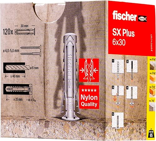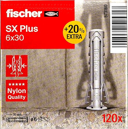 fischer Tassello in Nylon multimateriale SX Plus 6 x 30 + 20% di Contenuto aggiuntivo Gratuito/Confezione da 120, Taglia Unica