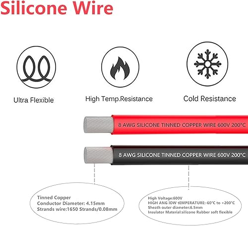 Filo in silicone 8 gauge 8 AWG 8,37 mm cavo elettrico 6 m, 3 m nero e 3 m rosso, flessibile, 1650 fili in rame stagnato ad alta temperatura 0,08 mm per auto telecomandate, marine, droni