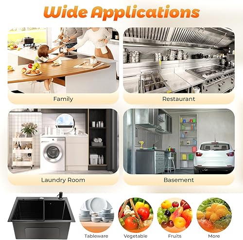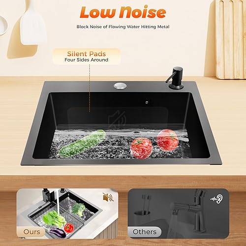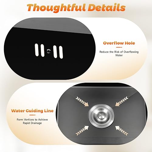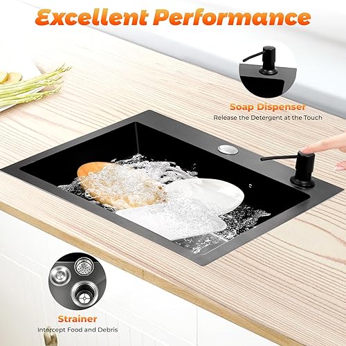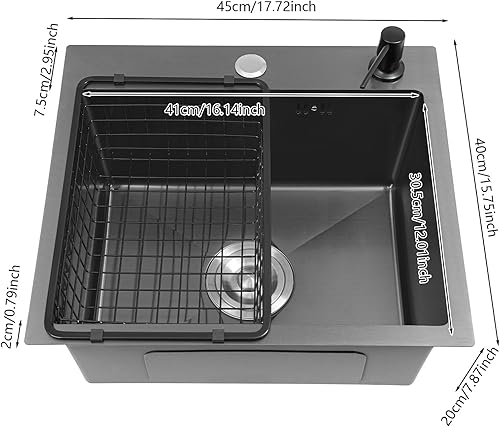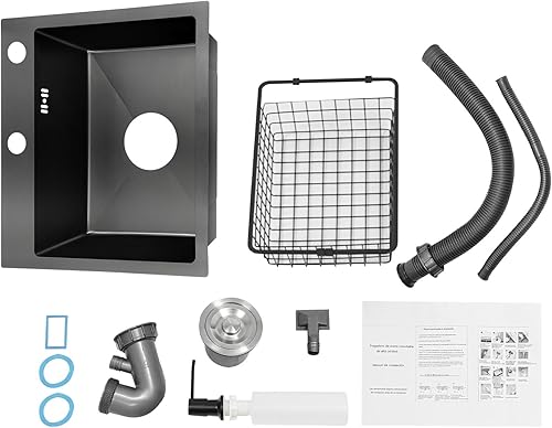 Lavello da cucina, 45 x 40 cm, con cestello di scarico e dispenser di sapone in acciaio inox, 1 vasca, colore nero