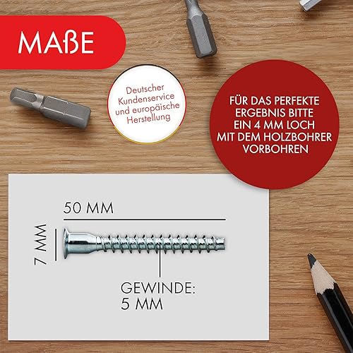 Viti di collegamento 5 x 50 mm | Set di 50 viti di fissaggio per armadio in acciaio zincato | Confermmat esagonale cavo | Viti per mobili con testa svasata per un collegamento stabile