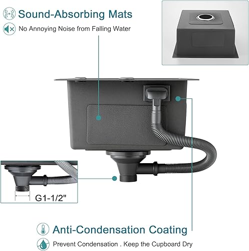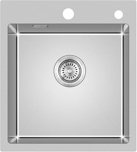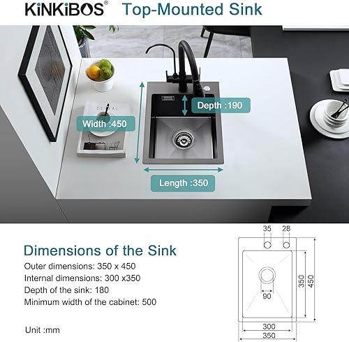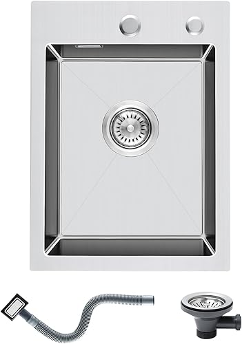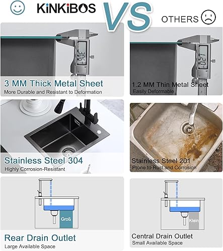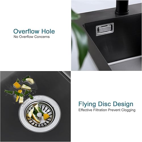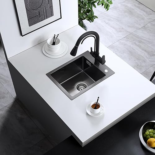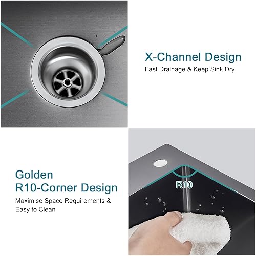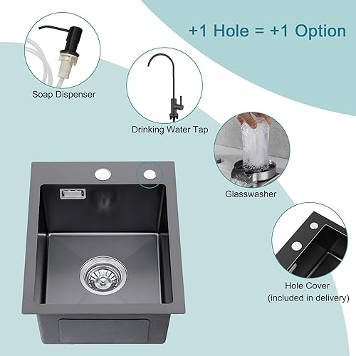 Lavello da cucina in acciaio inox 304, 35 x 45 cm, lavello da cucina piccolo, con foro per rubinetto e troppopieno (senza tubo di scarico), 1 vasca, grigio-nero