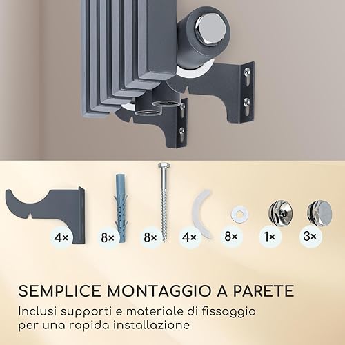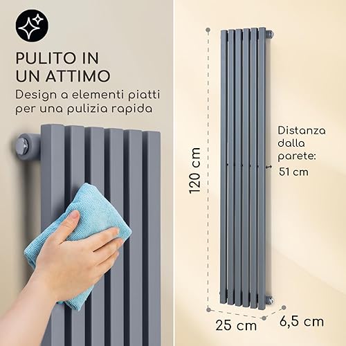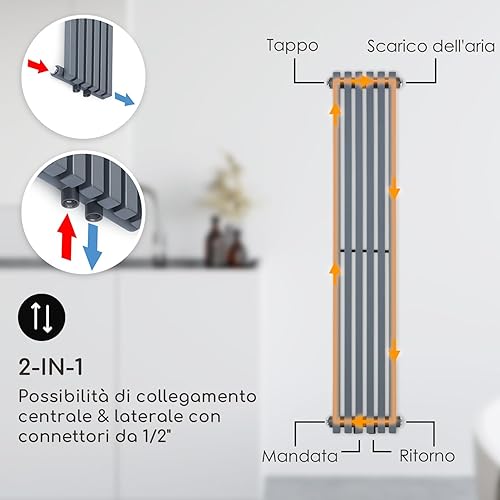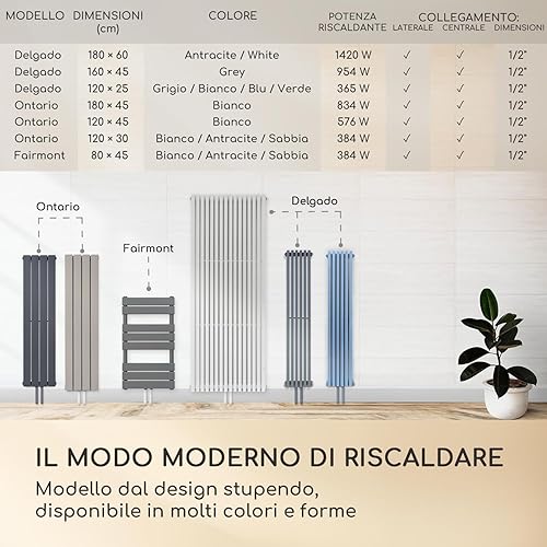 Delgado - Radiatore 160x45, Radiatore Tubolare, 12 Alette Verticali, 2-in-1: Attacco Centrale o Laterale/Attacchi da 1/2', a Parete, 822W / max.70 °C/max. 10,1 bar, Slim, 8-20 m², Grigio
