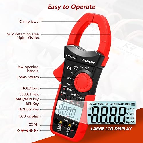 Pinza Amperometrica, LC-570S-APP Bluetooth Multimetro a Pinza TRMS per AC/DC Corrente Tensione Resistenza Cap Frequenza Diodo Continuità Temperatura NCV con Retroilluminazione