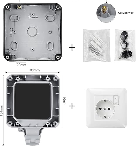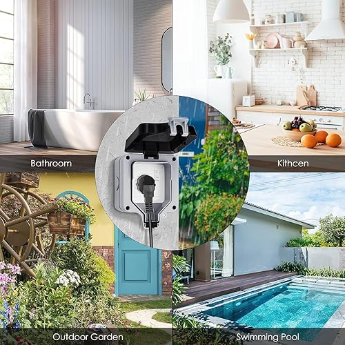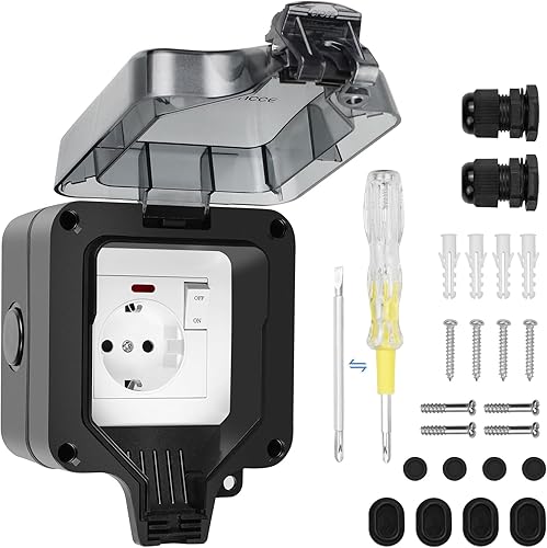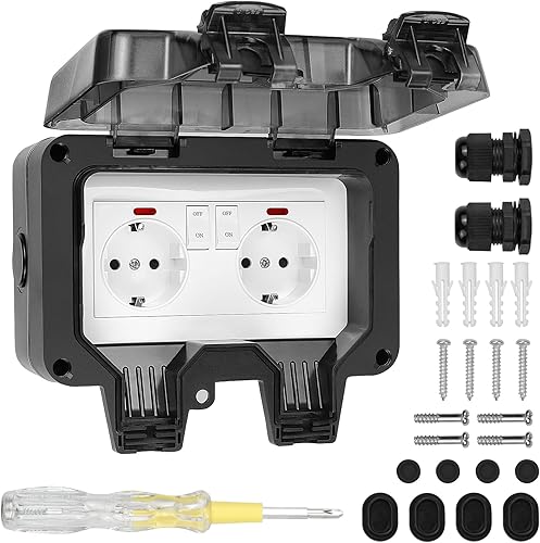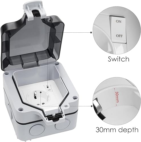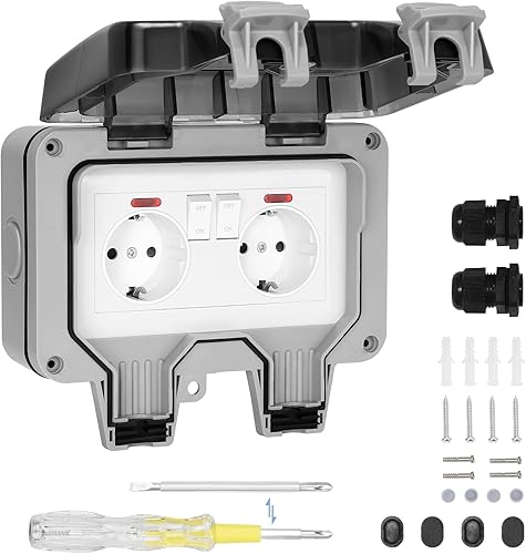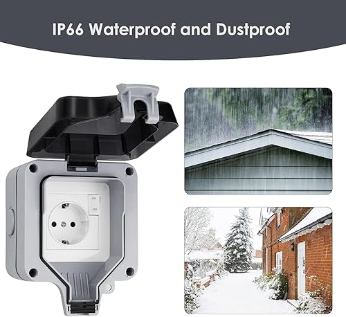 2 Presa Esterno Impermeabile IP66 con Interruttore, Connettore da Impermeabile e Coperchio Incernierato, Presa Elettrica Esterno per Cucina, Bagno, Garage, Piscina e Giardino
