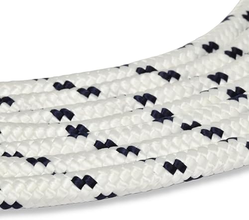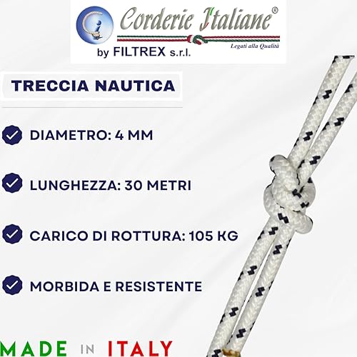 006000426 Treccia mare multiuso giardino e fai da te, stabilizzato ai raggi U.V. resistente a intemperie e agenti atmosferici, 4 mm, 30 mt, colore bianco con spia blu