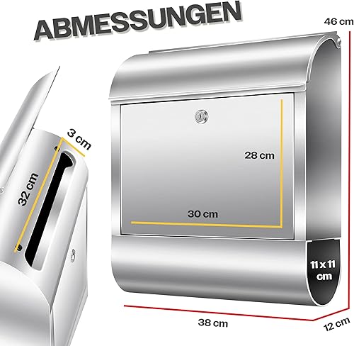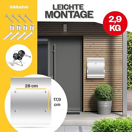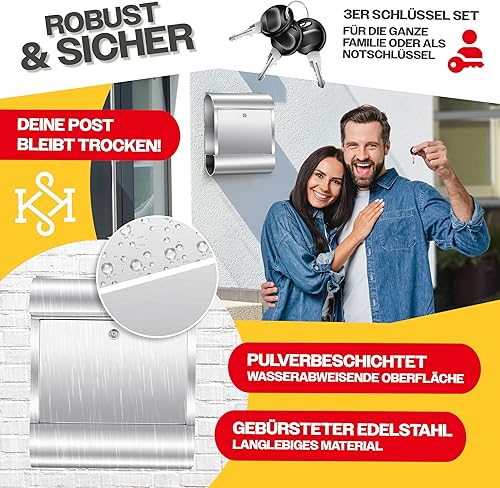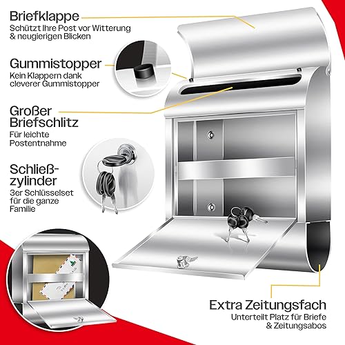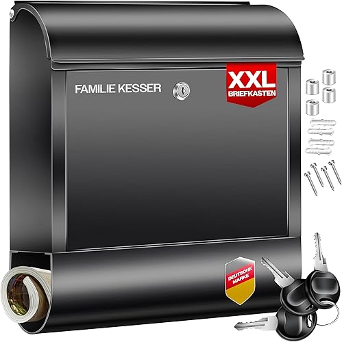 KESSER® Cassetta della Posta XXL in acciaio inox spazzolato con Scomparto per Giornali, 3x Chiudibile a chiave, Verniciata a polvere, Montaggio a parete, Ampia fessura frontale, Nero