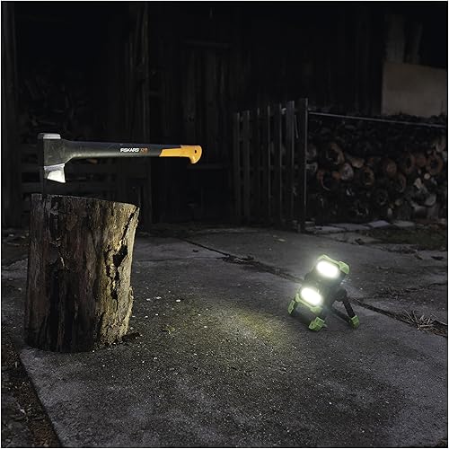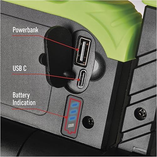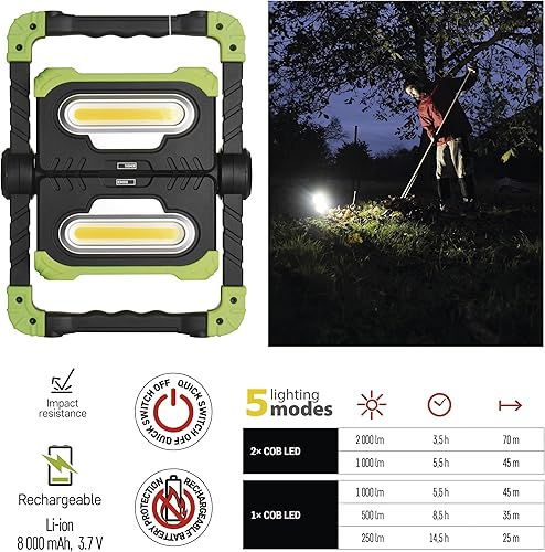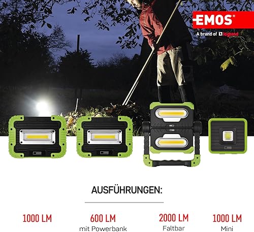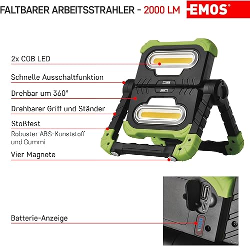 EMOS LED Pieghevole, Luce da Lavoro Girevole a 360° con Supporto, Super Luminoso 2000 lm Faro Portatile a Batteria per l’edilizia, Ricaricabile USB 8000 mAh, Portata 70 m, Verde/Nero