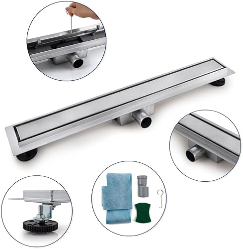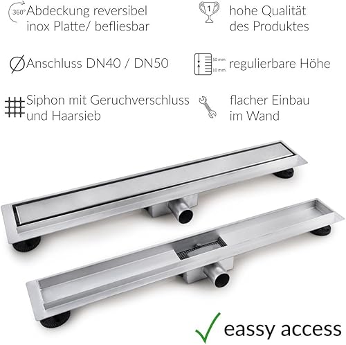 Canaletta di scarico a doppio lato Duplex, autopulente, con sifone antiodore, da 60-120 cm, per bagno, lavanderia, balcone, docce molto piatte, Argento