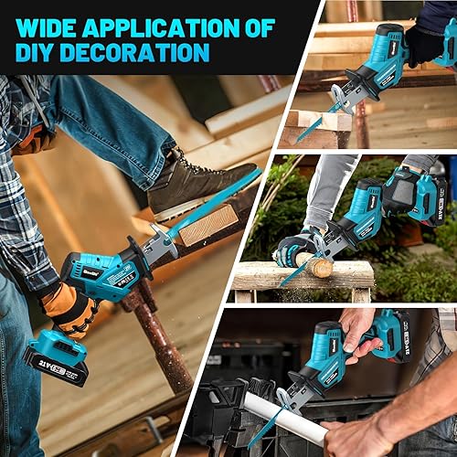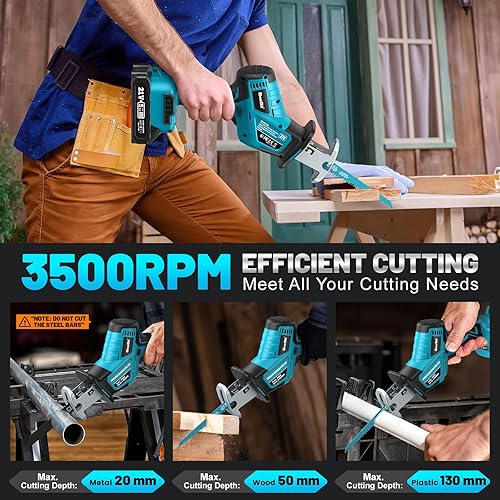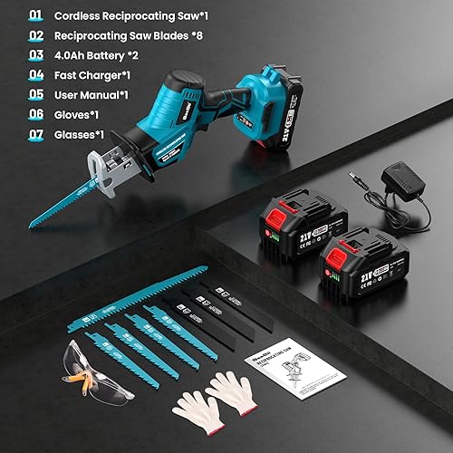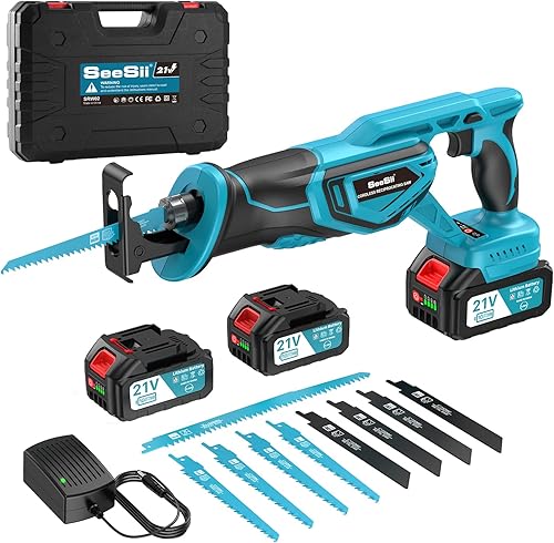 Seesii Sega a sciabola a batteria, 3500 RPM, motore brushless con 2 batterie da 4,0 Ah, luce LED, 8 lame portatili per legno e PVC