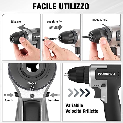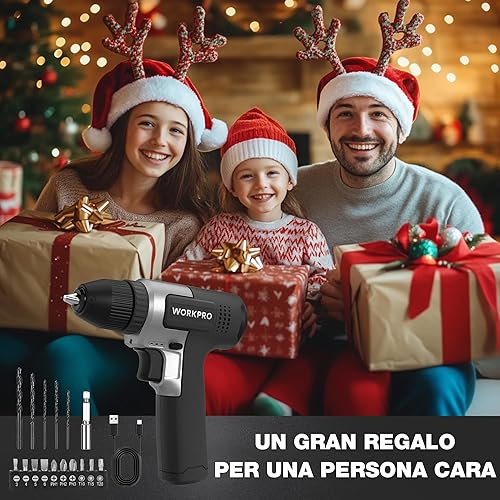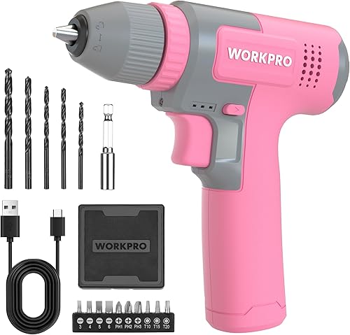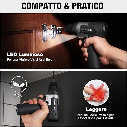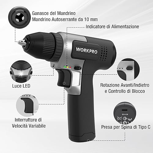 WORKPRO Trapano a Batteria 8V, Trapano Elettrico con Mandrino da 10 mm, Cacciavite Elettrico, Cacciavite con Velocità Variabile, Cacciavite Ricaricabile Tipo C, con 15 Accessori, Nero