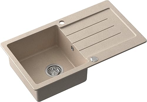 Lavello da cucina in granito | dimensioni 77 x 44 x 18,5 cm, beige e acciaio | Lavello JOHNNY 111 in granito Lavello a vasca singola | Lavello da incasso con foro per rubinetto