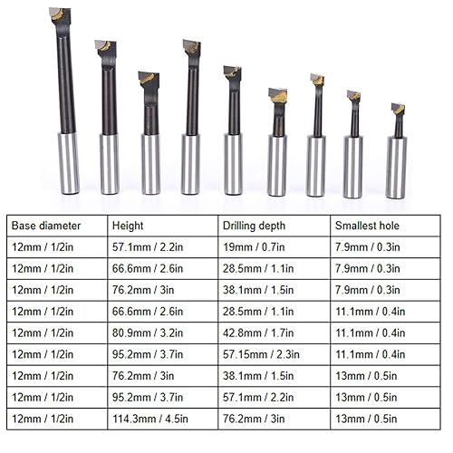 9 PZ 1/2'Set di barre alesatrici Punte in metallo duro di qualità PRO 1/2' Utensile per tornio con gambo Profondità di foratura 19/28,5/38,1/28,5/42,8/57,15/38,1/57,1/76,2 mm