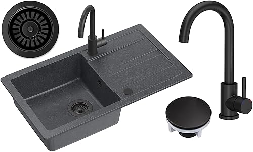 Lavello da cucina in granito | Dimensioni 77 x 44 x 17,6 cm Molto nero | Lavello GO MAX Lavello da incasso con rubinetto da cucina | Lavello a vasca singola Lavello da cucina