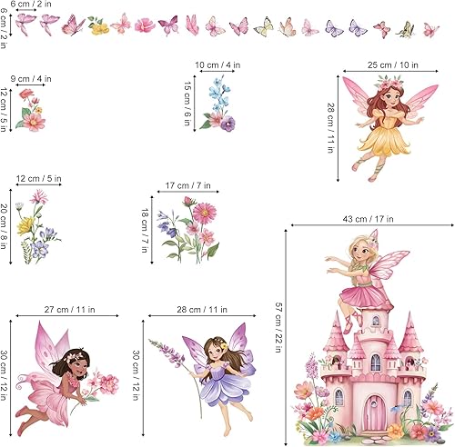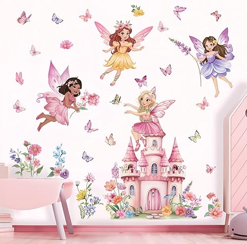 wondever Adesivi Murali Fata Ragazza Castello Sticker da Muro Fiori Elfi Farfalle Adesivi da Parete per Camere Ragazze Asilo Nido Camerette Bambini