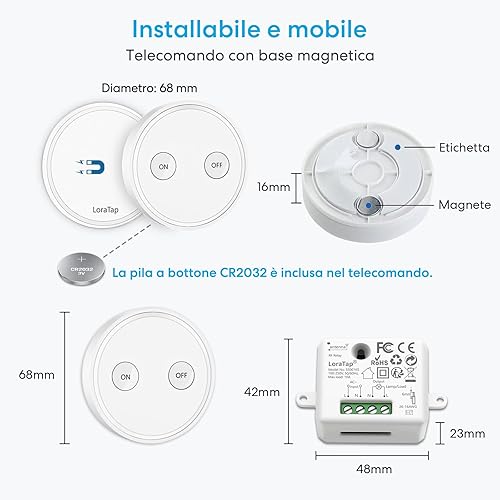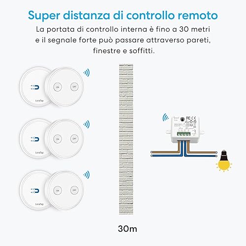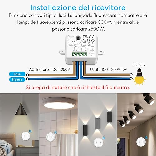 Paio Interruttore per Luce Senza Fili, LoraTap 3pz Interruttori Remoto con Base Magnetica 1 Ricevitore a Relè 2500W, Telecomando 200m 230V, On/Off Switch Wireless per Lampade e Apparecchi Elettrici