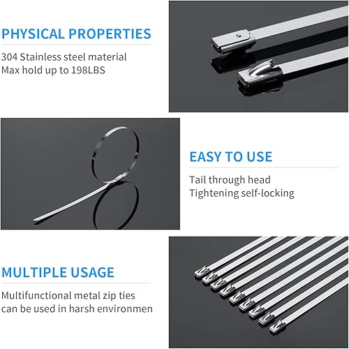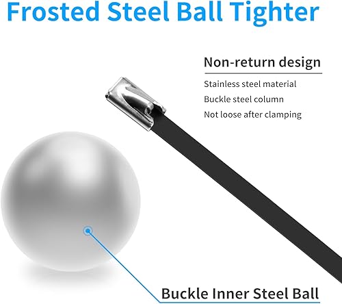 Fascette in metallo nero da 30 cm (confezione da 200), fascette in acciaio inossidabile 304 resistenti, resistenza alla trazione 136 kg, fascette autobloccanti multiuso per avvolgimento di