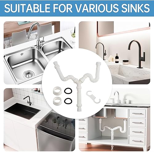 GLFLOW Doppio sifone, kit di scarico flessibile per doppio lavello: kit di sifone regolabile da 20 a 80 cm, per lavelli G1-1/2 e G1-1/4 per lavelli, lavelli