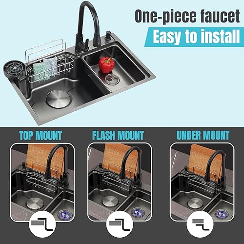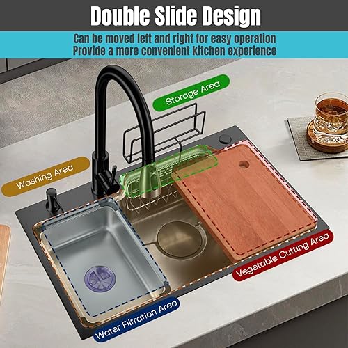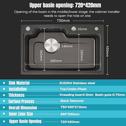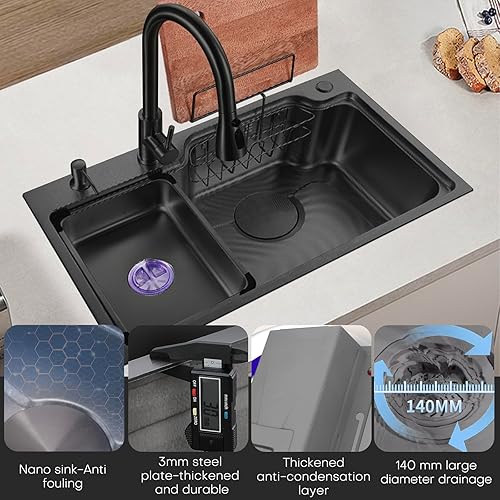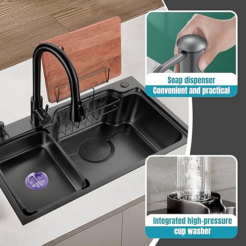Lavello da Cucina Multifunzionale 75 x 45 cm Rivestimento Nano 3mm in Acciaio Inox 304 con Lavatazze Dispenser di Sapone Cestello di Scarico Sospeso Nero