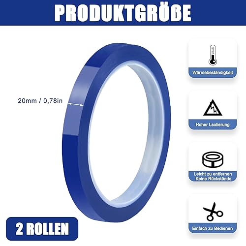 Nastro Adesivo Resistente al Calore, 2 Rotoli Nastro Termico Blu per Sublimazione, 20 mm x 33 m Nastro Adesivo Isolante Kapton Tape, per circuiti stampati elettronici fai da te