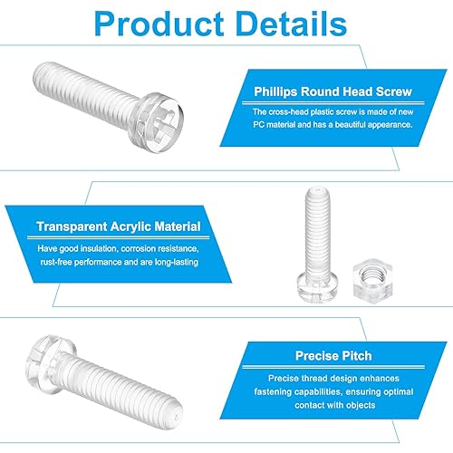 Kit Viti Acrilico Trasparente M3x20mm e Dadi Esagonali, 50 Set Viti a Testa Rotonda Phillips Plastica Pc per Accessori Macchine, Trasparenti