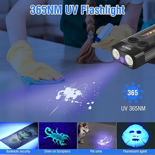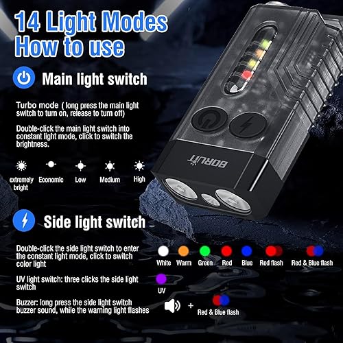 BORUIT V10 Torcia LED Ricaricabile 1000LM Mini Torce Portachiavi con 365 NM UV, Magnete, 14 Modalità IPX4 Impermeabile, USB C Portatile Flashlight