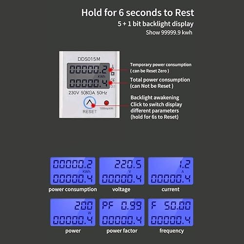 Contatore Energia Elettrica, DDS015M misuratore consumo elettrico, misura consumo monofase, Contatore di energia su guida Din 230V 5 (80) A retroilluminato Display Misuratore di energia elettronico