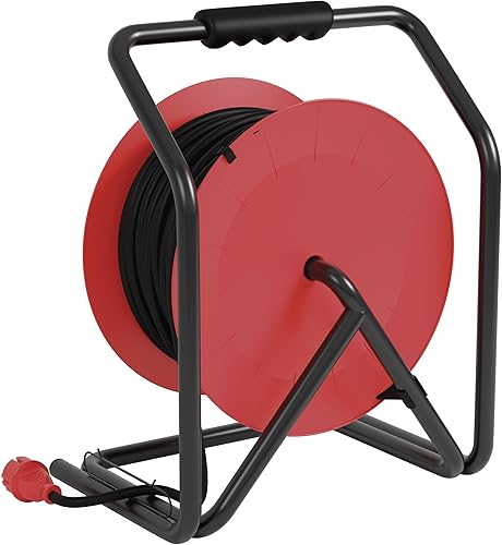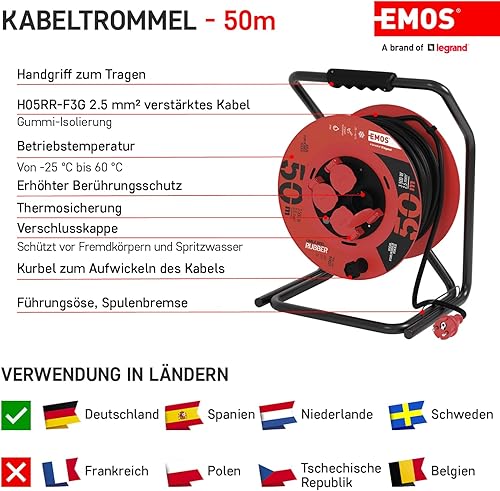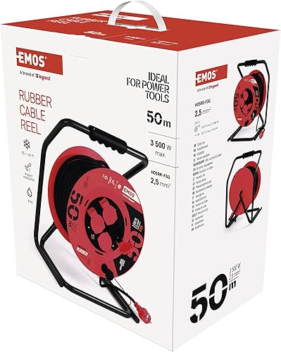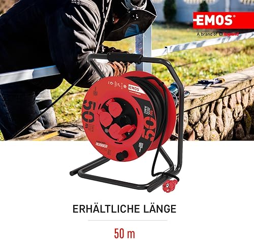 EMOS P19221 Avvolgicavo 50m-4 Prese Schuko-Impermeabile, Urti, Resistente alle temperature-230 V, 15 A, 3500 W-Isolamento in gomma-H05RR-F 2,5 mm2-IP44 per Esterni, Grigio, Blu, Nero