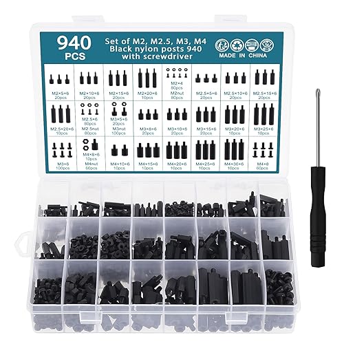 HSEAMALL 940 pezzi in nylon esagonale standoff distanziatore vite dado M2 M2.5 M3 M4, nero filettatura esterna colonna PCB scheda madre standoff vite