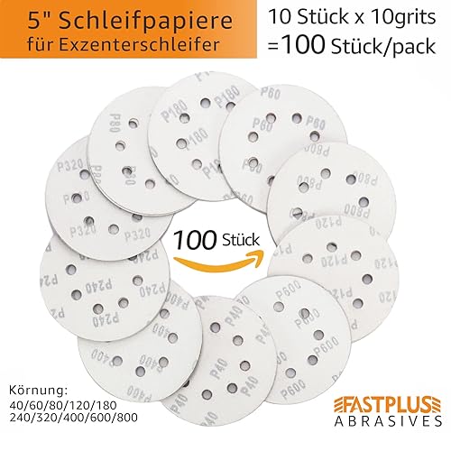 100 fogli di carta vetrata, 125 mm, 8 fori, 10 x 40/60/80/120/180/240/320/400/600/800, carta vetrata mista per levigatrice orbitale