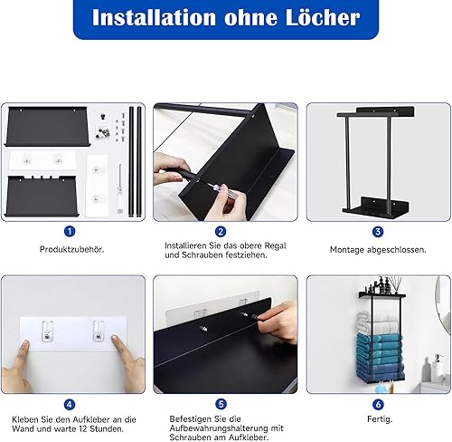Asdsed Porta Asciugamani da Bagno, Autoadesivo Per Porta Salviette in Porta Asciugamano, Altezza Regolabile 38-75CM Bagno Portasciugamani (Nero)