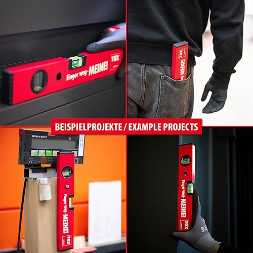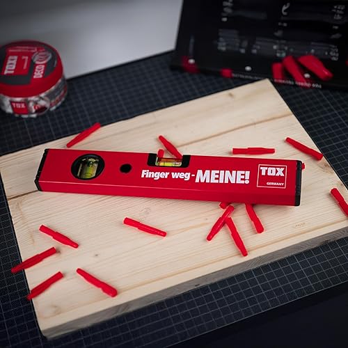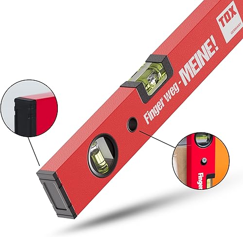 TOX Livella 30 cm, rossa con scritta 'Finger weg - MEINE', bolle orizzontali e verticali, in alluminio con verniciatura a polvere e tappi in gomma antiurto, 1 pezzo, 09790014