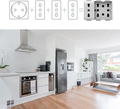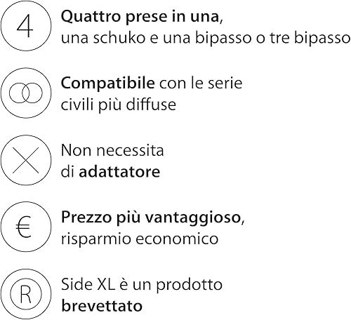 Presa da Incasso Side XL Compatibile con Bticino® Matix™. 4 Prese in 1: permette di collegare una spina schuko e una spina 10/16A o tre spine 10/16A. Colore Bianco