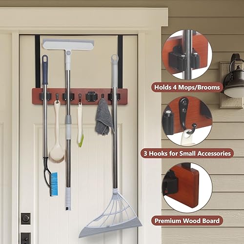 Porta Scopa per Porta, Porta Scopa a Parete Senza Foratura, Bambù, 4 Supporti + 3 Ganci per Cucina, Scale, Bagno, Garage