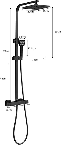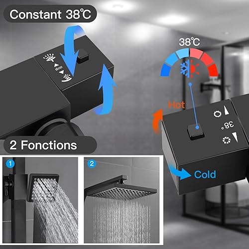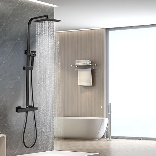 STANEW Colonna Doccia Con Miscelatore Termostatico,Set Doccia a Pioggia con Soffione e Doccetta a Mano,Doccetta flessibile, in acciaio INOX 304,Regolabile in altezza, Nero