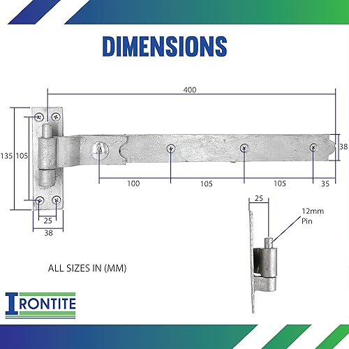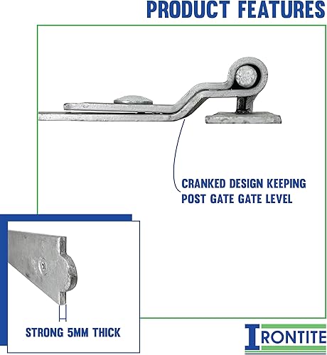 IRONTITE® Cerniere per cancello zincate a gomito resistenti, 400 mm, gancio e fascia per cancelli in legno, cerniere zincate a manovella con fissaggi inclusi (zincate)