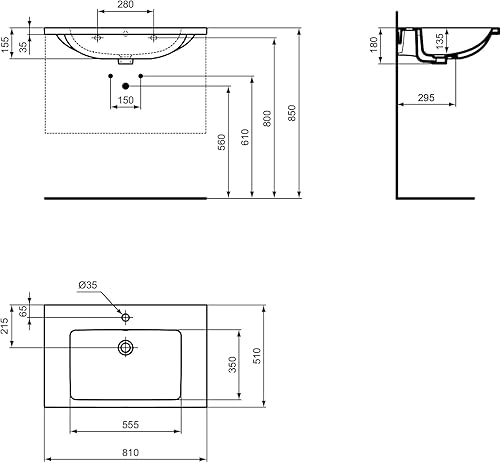 Ideal Standard - i.life B, Lavabo Top da 81 cm con foro centrale per la rubinetteria e troppopieno, Bianco