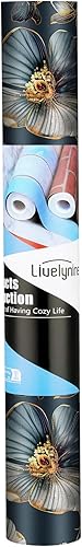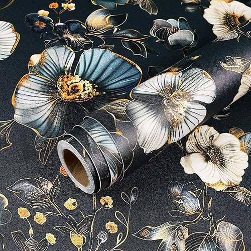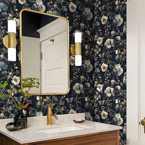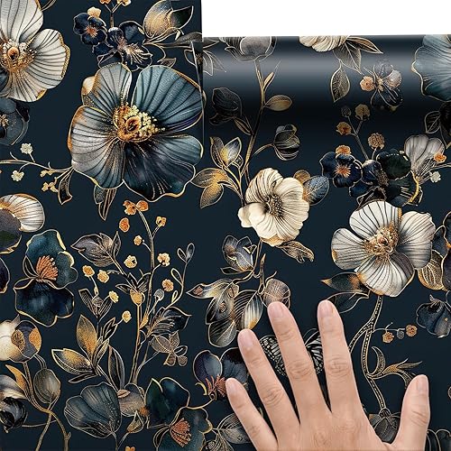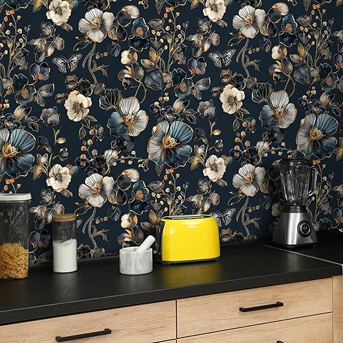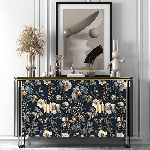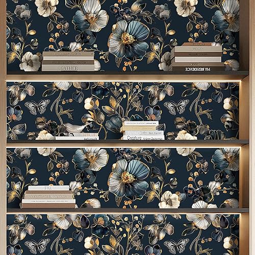 Livelynine Carta da Parati Adesiva Muro Floreale Blu Oro Pellicola Adesiva per Mobili Fantasia Blu Scuro con Fiori Farfalle Foglie Carta Parati Adesivi Muro Fiori Camera da Letto Soggiorno 44.5CMx2M