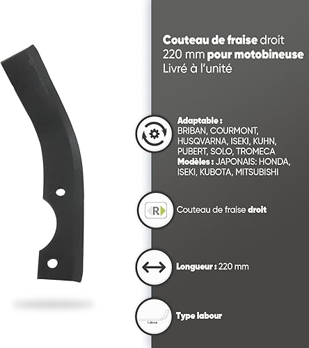 GREENSTAR - Coltello da fresa 220 mm per motobineuse Courmont, Husqvarna, Iseki, Kuhn, Pubert, Solo, Tromeca, Honda, Kubota, Mitsubishi - Coltello dritto