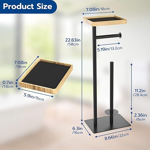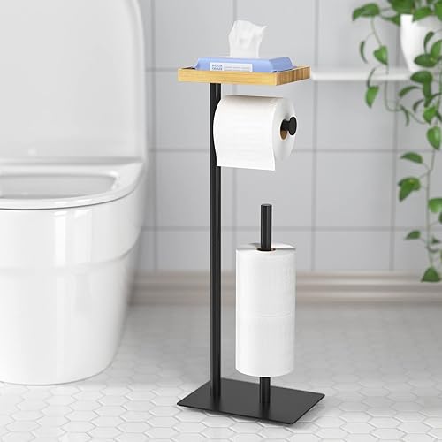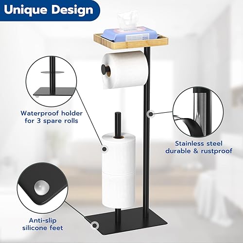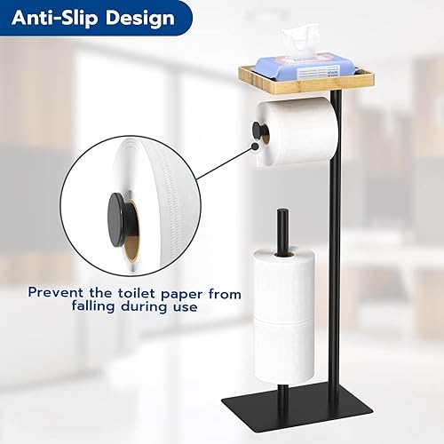 Portarotolo autoportante con ripiano superiore in bambù, supporto portarotolo carta igienica nero, dispenser per carta igienica da pavimento, 4 rotoli di riserva