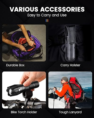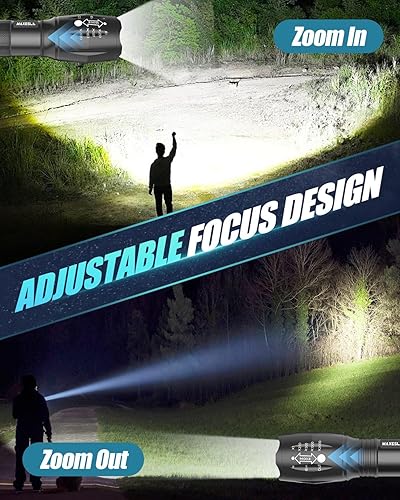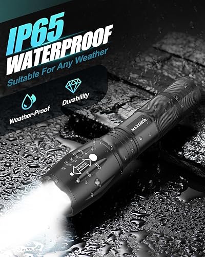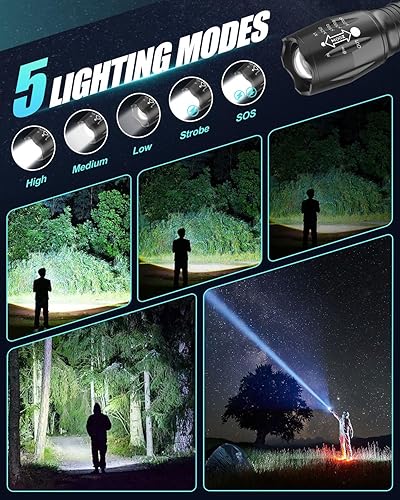 Torcia LED Potente Professionale, 2000 Lumen Torcia LED Potente, Torce LED Alta Potenza con 18650 Ricaricabile Batteria 5 Modes, Zoomable, IP65 Impermeabile, nero