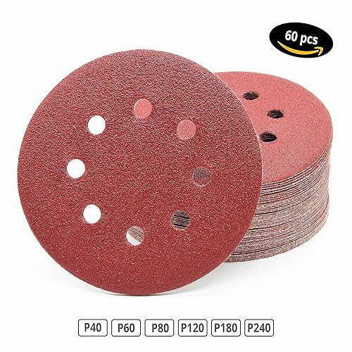 60 pezzi - dischi abrasivi (carta vetrata) con Ø 125 mm, assortimento: 10 pezzi per ogni tipo di grana 40/60/80/120/180/240 per levigatrice orbitale con 8 fori …