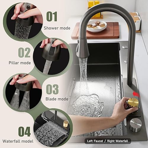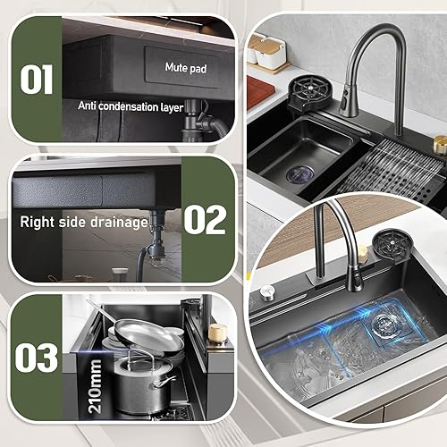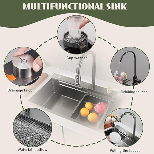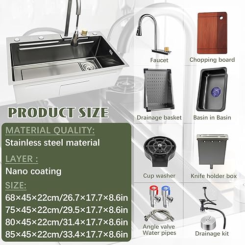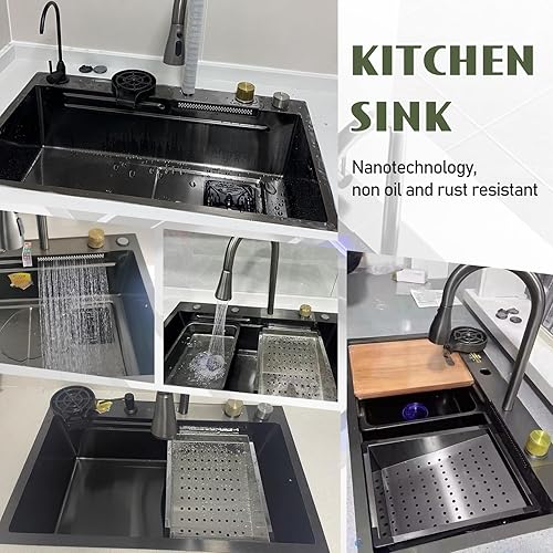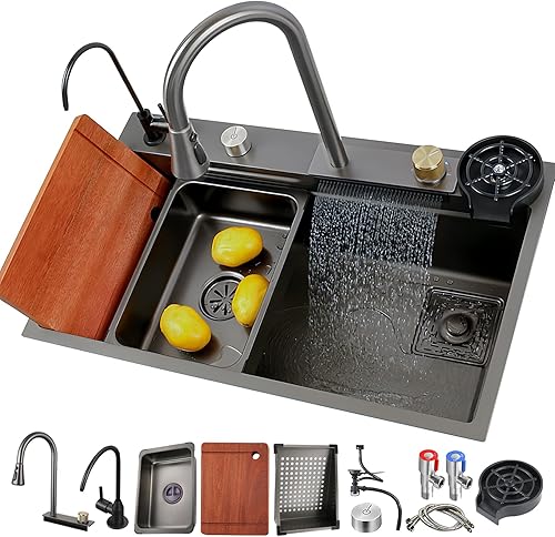 Grande lavello in acciaio inox, 80 x 50 cm, con effetto cascata, per cucina e bar, realizzato a mano, con accessori completi, robusto lavello da lavoro