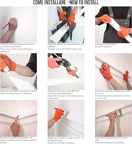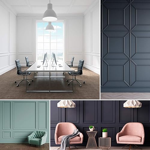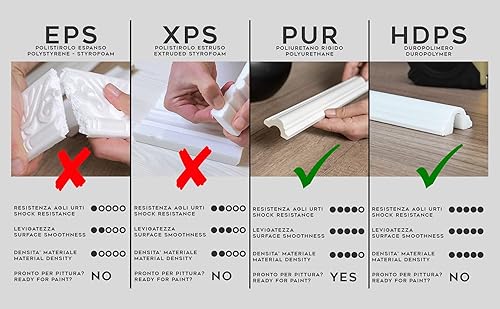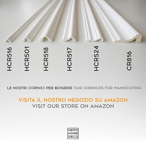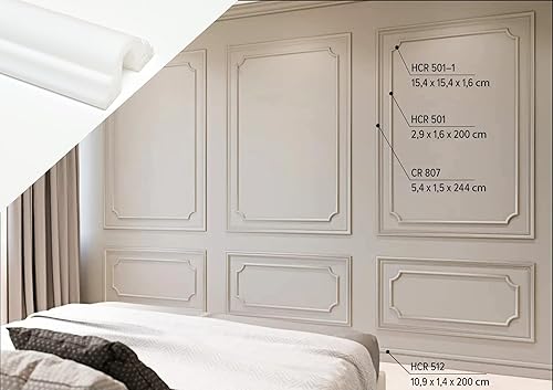 Cornici per parete boiserie, 12 metri di profilo decorativo 3d, in duropolimero bianco rigido(meglio del polistirolo e gesso), da applicare a muro, 12 pezzi da 1 metro (HCR 501)