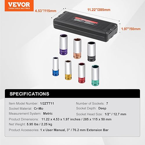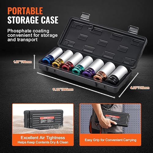 VEVOR Set di Bussole per Dadi Ruota, Attacco da 12,7 mm, 6 Punti Metriche Profonde, 7 Dimensioni 17/19/21/22/23/24/27 mm, in Cr-Mo